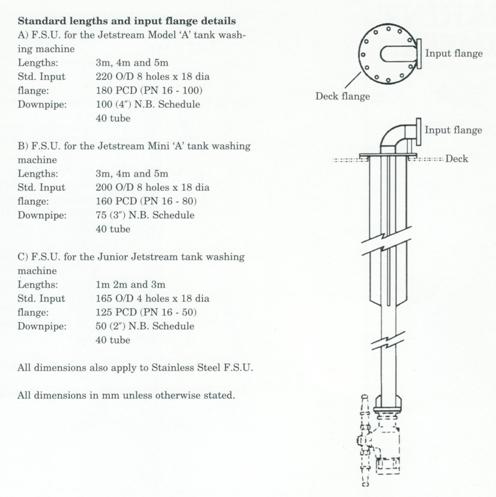 The Free Standing Unit is basically a fixed downpipe, stiffened for strength and rigidity, to which a flanged tank washing machine can be mounted at various depths below the deck level.